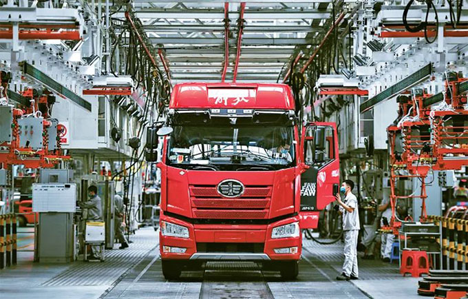企業(yè)強(qiáng)則國家強(qiáng),加快建設(shè)世界一流企業(yè)是全面建設(shè)社會主義現(xiàn)代化國家的重大任務(wù),是新時(shí)代國有企業(yè)的戰(zhàn)略目標(biāo)。近來,一汽解放集團(tuán)股份有限公司生產(chǎn)按下“加速鍵”。圖為2022年6月15日,工人在位于吉林長春的一汽解放總裝車間內(nèi)裝配車輛。 新華社記者 許暢/攝